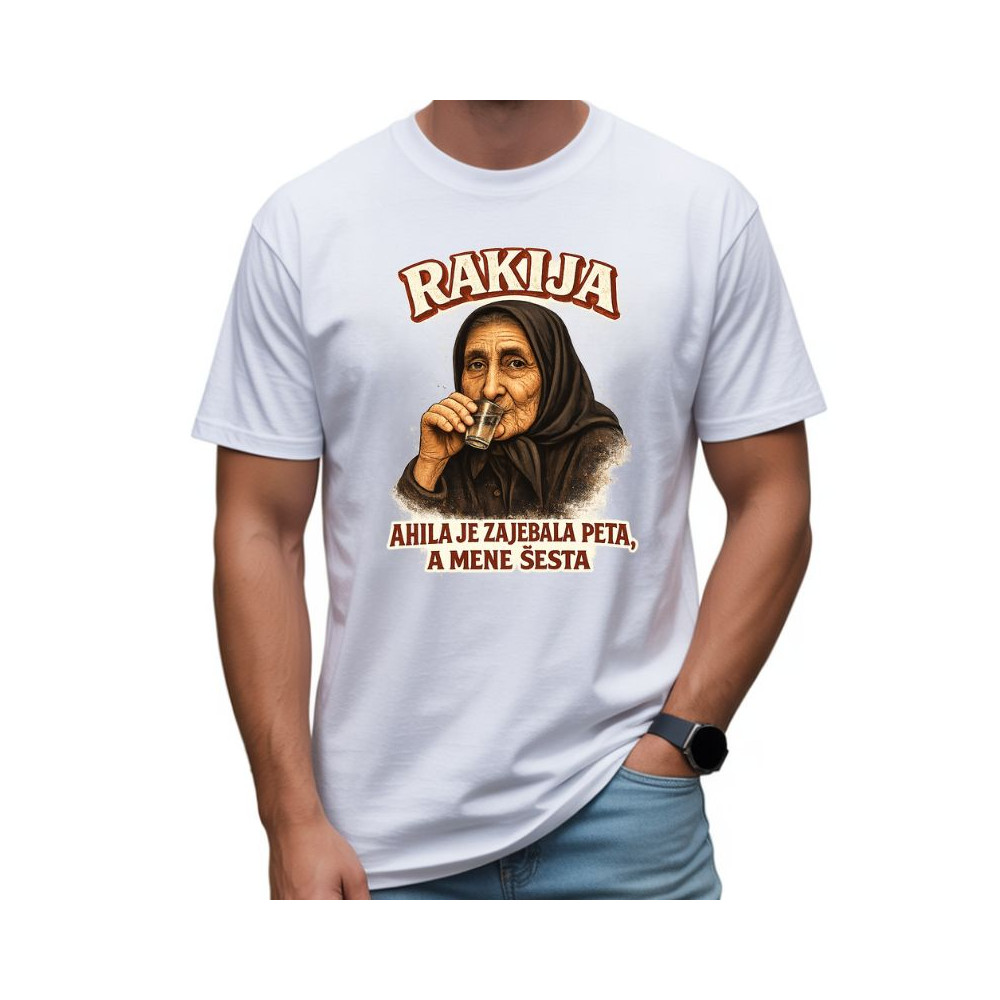 Moška majica Rakija z ilustracijo in duhovitim napisom, ki se poigra z mitologijo in balkansko realnostjo. Za tiste, ki vedo, da se prave lekcije začnejo šele po petem kozarčku.